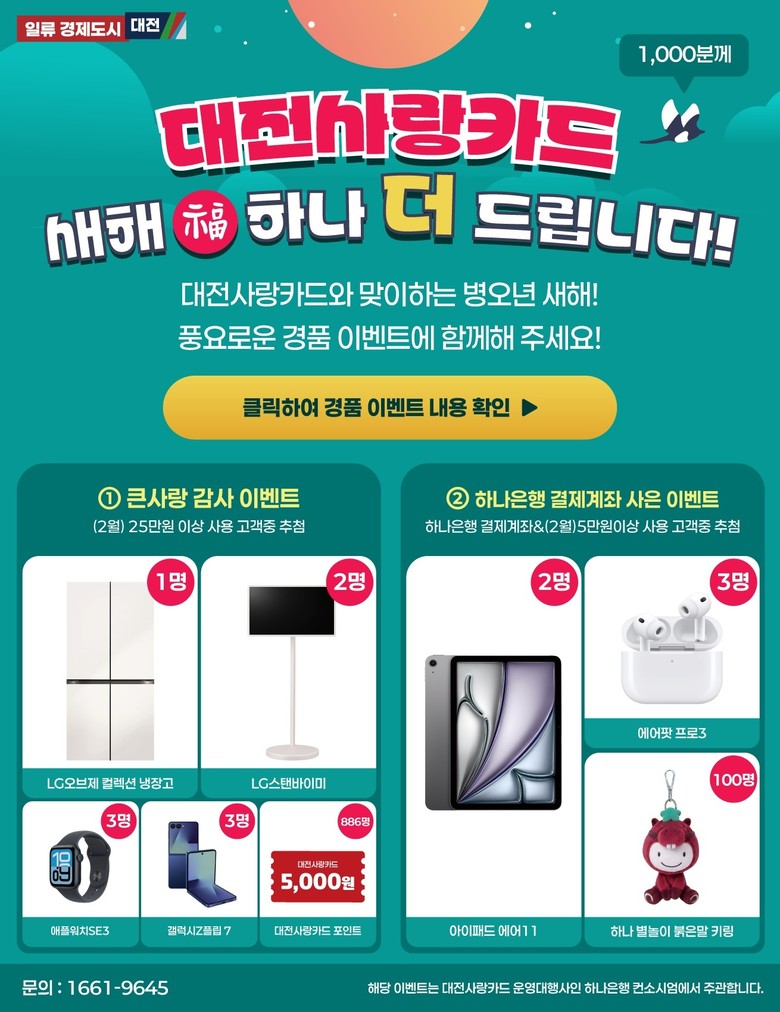 2월 한 달간 대전사랑카드를 25만 원 이상 사용한 고객 중 895명을 추첨해 1등 냉장고, 2등 스탠드형 TV 등 다양한 경품을 제공한다. 또한 대전사랑카드 결제계좌가 하나은행이면서 5만 원 이상 사용한 고객 105명에게는 스마트패드와 무선이어폰 등 추가 경품을 증정한다.