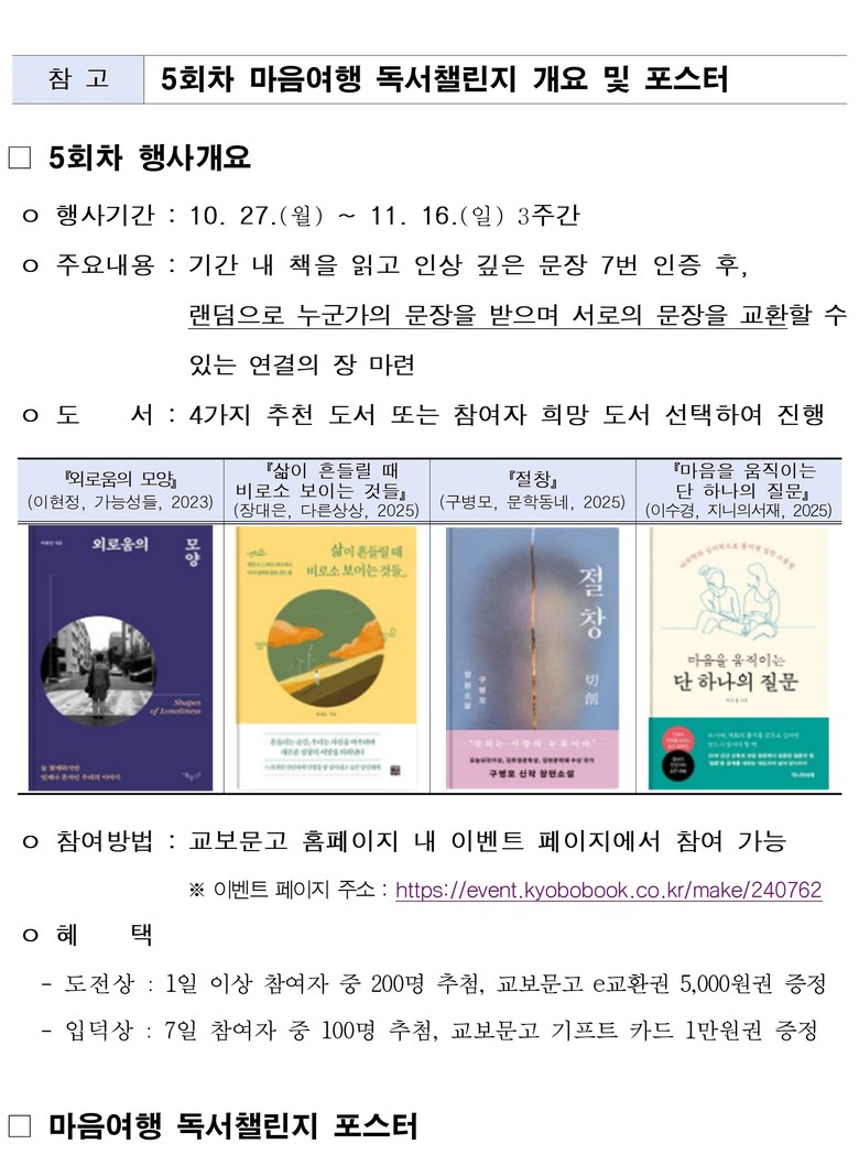 다섯 번째 ‘마음여행 독서챌린지’는 11월 16일(일)까지 3주간 진행되며, 4권의 추천도서 또는 본인이 희망하는 책을 읽으면 된다.